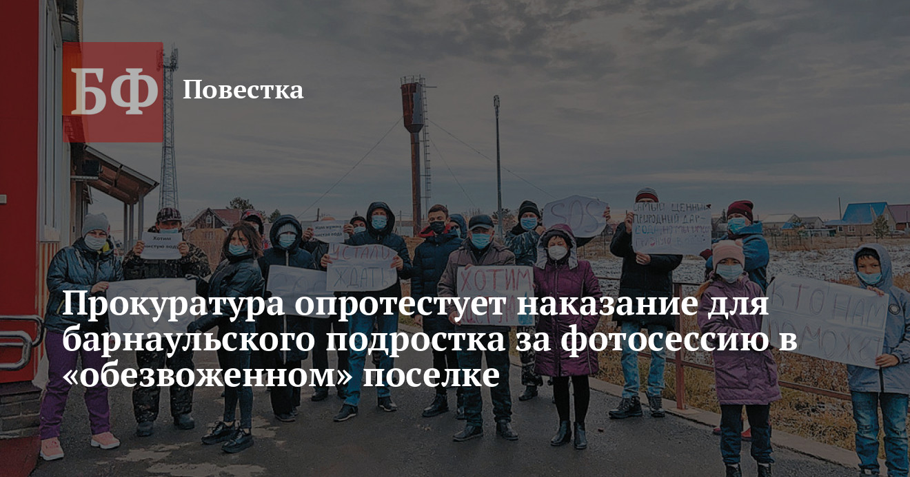 Прокуратура Центрального района Барнаула оказалась не согласна с решением комиссии по делам несовершеннолетних, которая привлекла к ответственности 16-летнего подростка из Барнаула Максима Ломакина. Ранее он стал участником фотосессии, призванной обратить внимание властей на проблему некачественного водоснабжения в поселке Сибирская Долина, которую полиция интерпретировала как несогласованную акцию. Женщине, которая была организатором мероприятия, выписали штраф, а ему вынесли предупреждение. Прокуратура решила опротестовать такой подход, сообщила ИА «Банкфакс» Уполномоченный по правам ребенка в Алтайском крае Ольга Казанцева в ответе на запрос.