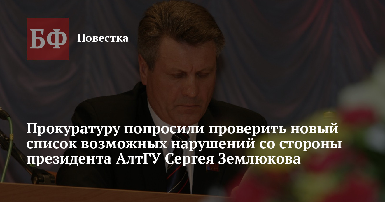 Жительница Барнаула подала обращение на имя прокурора Алтайского края Антона Германа с просьбой дать правовую оценку известным ей фактам о нарушениях, якобы совершенных президентом АлтГУ Сергеем Землюковым. Как стало известно «Банкфаксу», заявительница сообщила надзорному органу о том, что Землюков, по ее данным, использует служебный автомобиль в личных целях, летает по работе только бизнес-классом, а также мог занять место профессора в Юридическом институте по подложным документам.