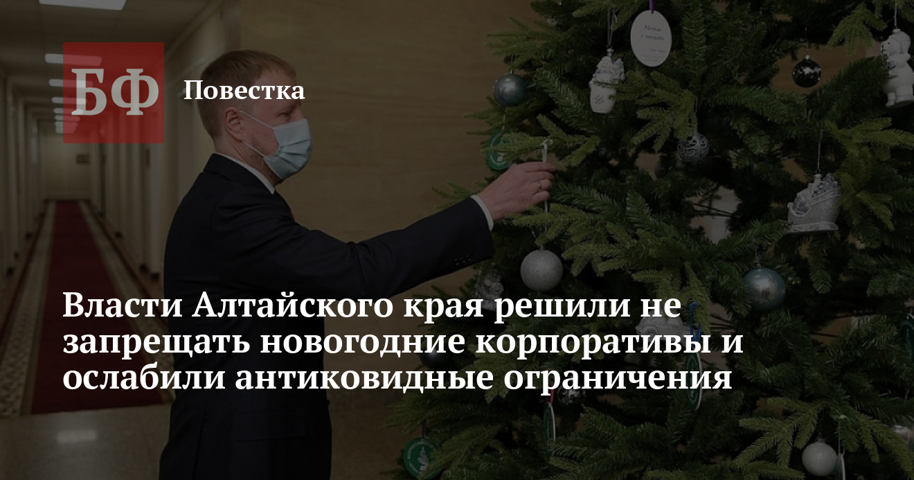 Губернатор Виктор Томенко подписал новую версию антиковидного указа, в которой были изменены ограничительные меры. Как отметила пресс-служба алтайского правительства, в этом году в крае не будут запрещать новогодние корпоративы, как этом было в прошлом. При этом ряд мер безопасности также ослабили.