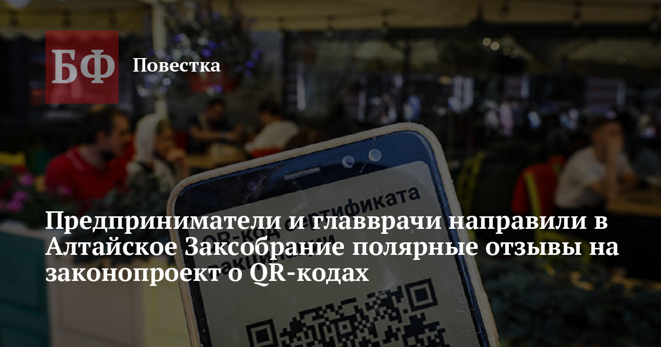 Алтайское Заксобрание опубликовало открытое письмо главврачей медучреждений региона, перепрофилированных в ковидные госпитали, которые выступили в поддержку проекта федерального закона о QR-кодах для вакцинированных. Сообщение об этом разместила пресс-служба парламента. При этом ранее свой отзыв на инициативу с противоположным мнением также направило предпринимательское сообщество (копия имеется в распоряжении ИА «Банкфакс»), но его руководство АКЗС решило не предавать огласке.