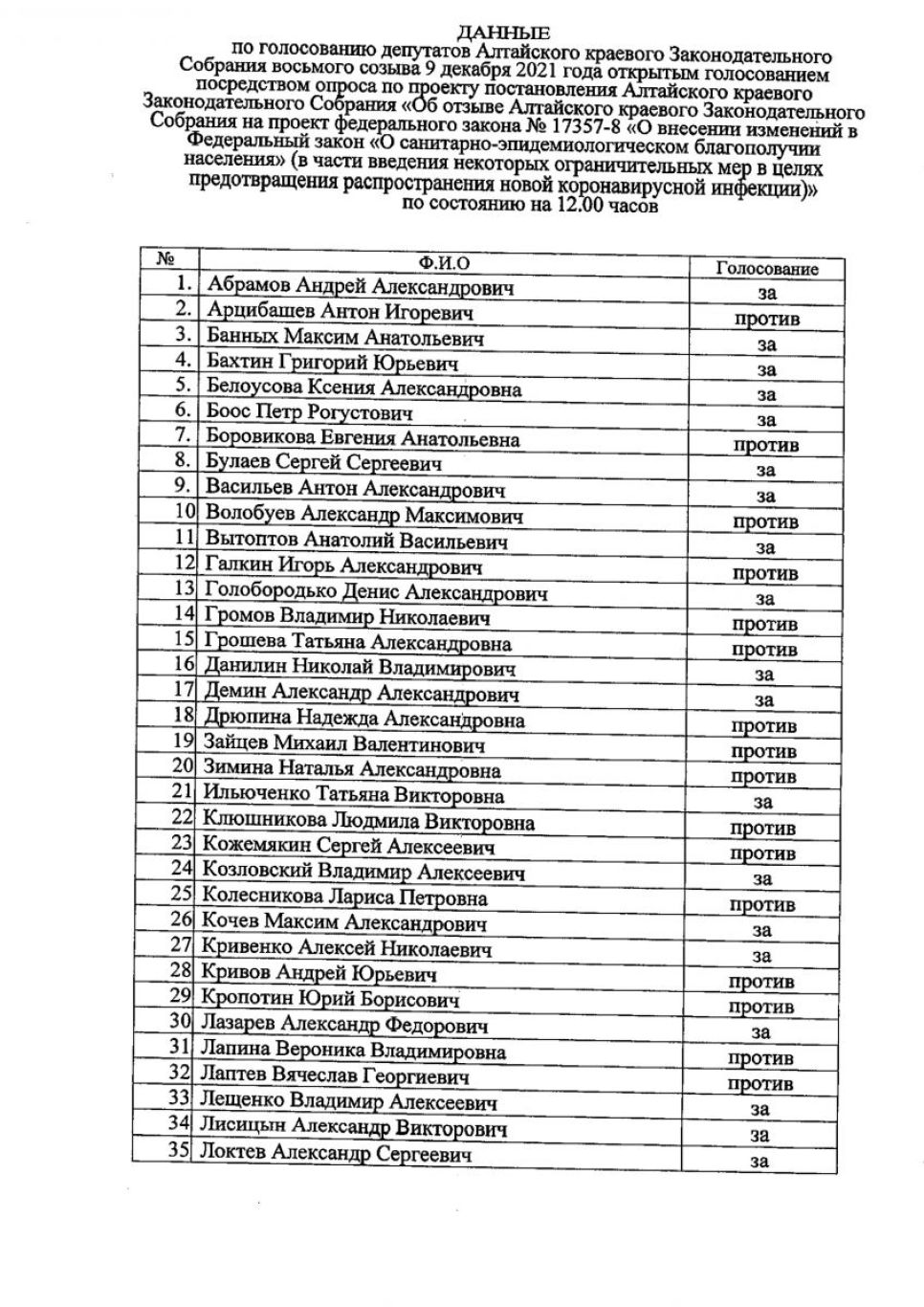 Выдержав некоторую паузу после объявления результатов опросного голосования по отзыву АКЗС на федеральный законопроект по введению QR-кодов, алтайский парламент все же представил сведения о том, кто из депутатов и как проголосовал. Примечательно, что две фракции практически полным составом отказались поддержать данные изменения — КПРФ и «Справедливая Россия — За правду». Тем не менее, большинством голосов проект был одобрен. Стоит отметить, что в стане коммунистов, которые больше других говорили о своем несогласии с данным законом, оказалась народная избранница, которая не согласилась с позицией фракции и поддержала введение QR-кодов.