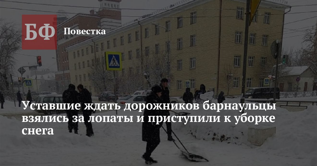 Многие улицы Барнаула остаются погребены под снежными завалами, несмотря на то, что обильных осадков в городе не выпадало уже больше недели. Сил муниципальных дорожников, работающих «практически каждый день», как выразился первый вице-мэр Анатолий Воронков, не хватает, чтобы привести дороги и тротуары в порядок, несмотря на отчеты мэрии о готовности к сложным погодным условиям. В связи с этим за лопаты пришлось взяться студентам и предпринимателям. В том, что к снегоуборочным работам привлечены волонтеры, призналась сама пресс-служба мэрии Барнаула.