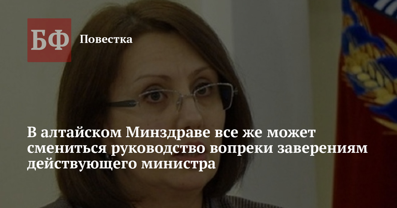 Заместитель главы Минздрава Алтайского края Наталья Белоцкая в новом году может возглавить ведомство, предполагают источники ИА «Банкфакс». Между тем действующий министр Дмитрий Попов всячески отрицает такую возможность: на днях он прокомментировал «Толку» инсайдерскую информацию о своем переходе на должность «социального» вице-премьера регионального правительства, назвав ее «размышлениями каких-то экспертов».