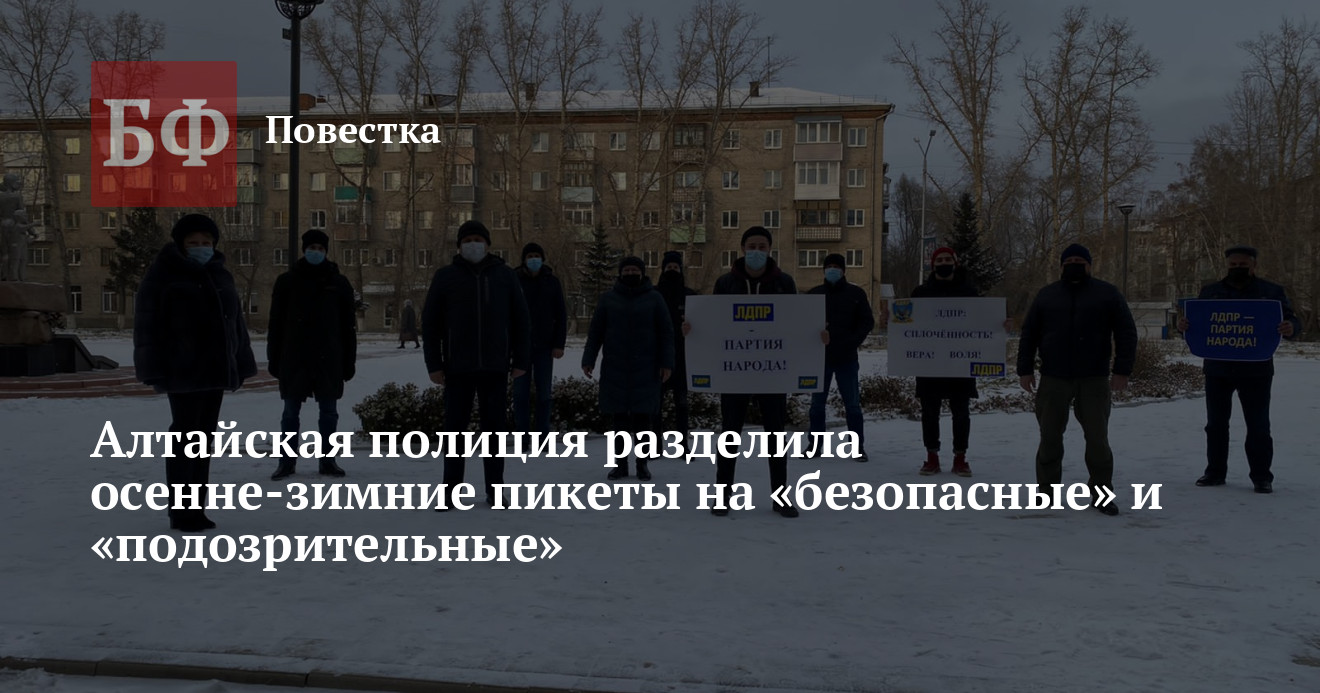 При этом никто из упомянутых объединений публично не говорил о проблемах с полицией из-за своих публичных акций. «Банкфакс» направил запрос в ГУ МВД России по Алтайскому краю, чтобы выяснить, посчитали ли правоохранители все эти мероприятия законными. В ведомстве ответили, что по двум из указанных фактов полиция пока проводит работу, а еще по трем признаков административного правонарушения не обнаружено. В региональном главке решили не уточнять, какие конкретно мероприятия выведены из категории незаконных, а также не стали пояснять, в чем разница между ними и теми одиночными пикетами, которые ранее посчитали правонарушением. Впрочем, разницу между «безопасными» и «запретными» публичными мероприятиями в полиции «Банкфаксу» не могли объяснить и ранее.