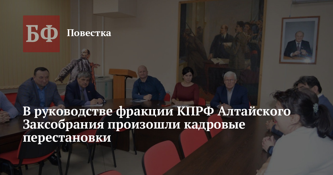 Андрей Кривов возглавит фракцию КПРФ в Алтайском Заксобрании вместо Александра Ткачева. Соответствующее решение было принято на заседании депутатского объединения, сообщается в официальном Telegram-канале крайкома партии. Не исключено, что это может быть связано с имевшими место ранее разногласиями между Ткачевым и рядом депутатов, хотя официально заявляется о том, что он решил сосредоточиться на работе в крайкоме.