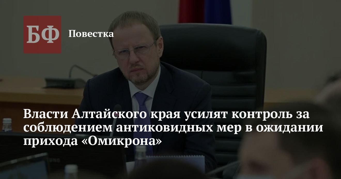 13 января под руководством губернатора Алтайского края Виктора Томенко прошло заседание регионального оперативного штаба, посвященное эффективности мер профилактики и контроля за возникновением и распространением COVID-19. Глава региона отметил, что ожидается ухудшение эпидемической ситуации в связи с распространением нового штамма «Омикрон», поэтому система здравоохранения Алтайского края должна быть подготовлена к серьезному росту числа заболевших. Чиновники решили пока не ужесточать антиковидных мер, однако намереваются усилить контроль за теми, что были приняты ранее. Власти полагают, что приход нового штамма может привести к непредсказуемым последствиям.