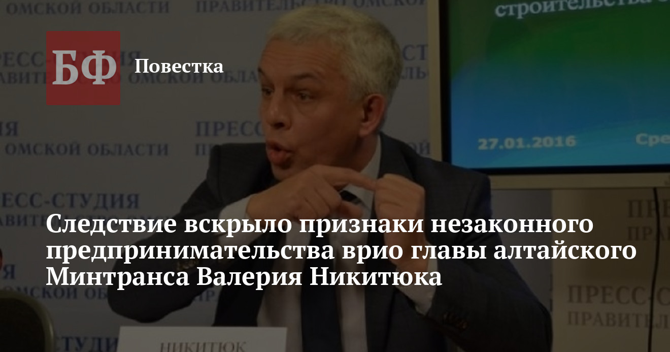 Временно исполняющий обязанности главы Минтранса Алтайского края Валерий Никитюк мог скрывать свои доходы, владение автомобилями и вести предпринимательскую деятельность, будучи госслужащим. Эти факты были установлены в результате проверки следователей по заявлению о мошенничестве и хищении имущества у одной из компаний Бийска (копия соответствующего постановления имеется в распоряжении ИА «Банкфакс»). Правоохранители выяснили, что Никитюк во время работы замглавы ведомства, а позднее и министром, фактически занимался бизнесом, причем сразу в двух фирмах, использовав подставных лиц по сути для «маскировки». Эти обстоятельства стали поводом для возбуждения отдельной проверки по уголовной статье.