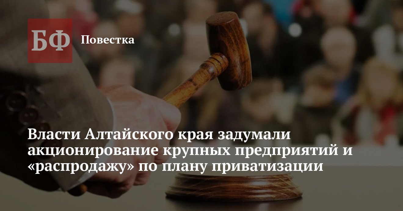 Согласно документу, раздел о приватизации акций (долей) хозяйственных обществ хотят дополнить продажей миноритарного пакета акций АО «Полиметалл» в размере 5%. Также реализации подлежит 25% акций АО «Бийское» (до недавнего времени АКГУП, занимается разведением КРС и производством молока). Кроме того, указаны планы полной продажи семи типографий — Алейской, Благовещенской, Змеиногорской, Каменской, Новоалтайской, Рубцовской и Славгородской. Ранее их уже пытались приватизировать, но не нашли потенциальных покупателей.