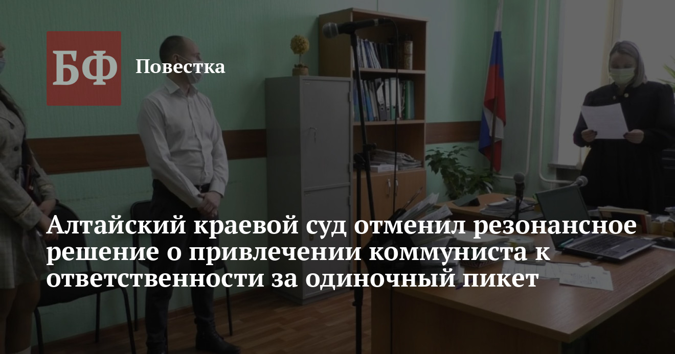 Антон Арцибашев подал жалобу в вышестоящую инстанцию, и там, как пишут коммунисты, вердикт Октябрьского районного суда не устоял. По их словам, Алтайский краевой суд согласился с их доводами о том, что одиночный пикет не является массовым мероприятием и, соответственно, не нарушает «ковидный» указ губернатора региона. Запись о том, что 18 января решение первой инстанции было отменено с прекращением производства в связи с отсутствием состава административного правонарушения, содержится в картотеке краевого суда.