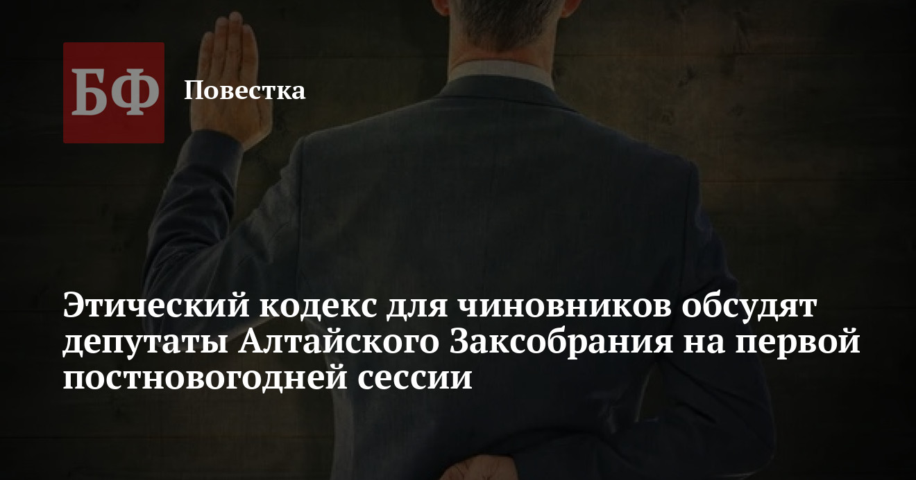 Для госслужащих Алтайского края могут ввести полноценный кодекс этики служебного поведения. Такие новации предусмотрены поправками в один из законов региона, которые обсудят депутаты Заксобрания на грядущей сессии, запланированной на 27 января. Помимо этого, парламентарии рассмотрят основания для досрочного прекращения полномочий чиновников, смягчение запрета на продажу баллончиков со сжиженным газом для несовершеннолетних, вопрос об инвестициях и ряд других.