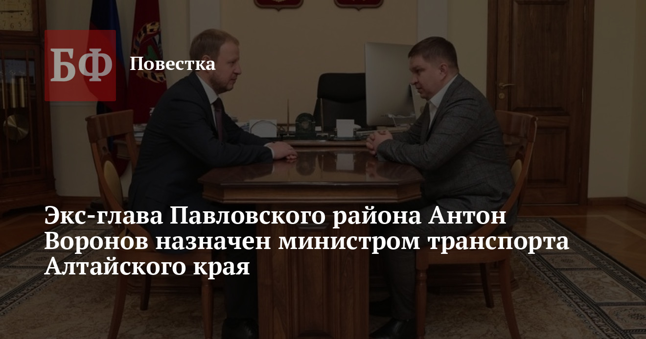 Антон Воронов, 4 февраля покинувший пост главы Павловского района, в тот же день назначен новым министром транспорта Алтайского края. Об этом сообщает пресс-служба кабмина. Таким образом подтвердилась одна из версий источников ИА «Банкфакс» о его повышении.