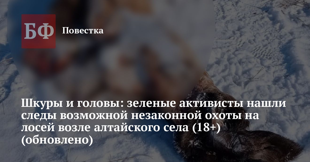 Эко-активисты из Усть-Калманского района обнаружили следы предположительно незаконной охоты на лосей возле села Ельцовка. Они рассказали ИА «Банкфакс», что нашли несколько шкур и отрезанных голов в местной роще и обратились в полицию, поскольку охотничий сезон на копытных закончился еще в прошлом году, да и сам участок входит в находящуюся под защитой зону. При этом источник агентства предположил, что на этой территории может действовать группа браконьеров, которая занимается сбытом мяса и якобы находится под покровительством силовиков и егерей.