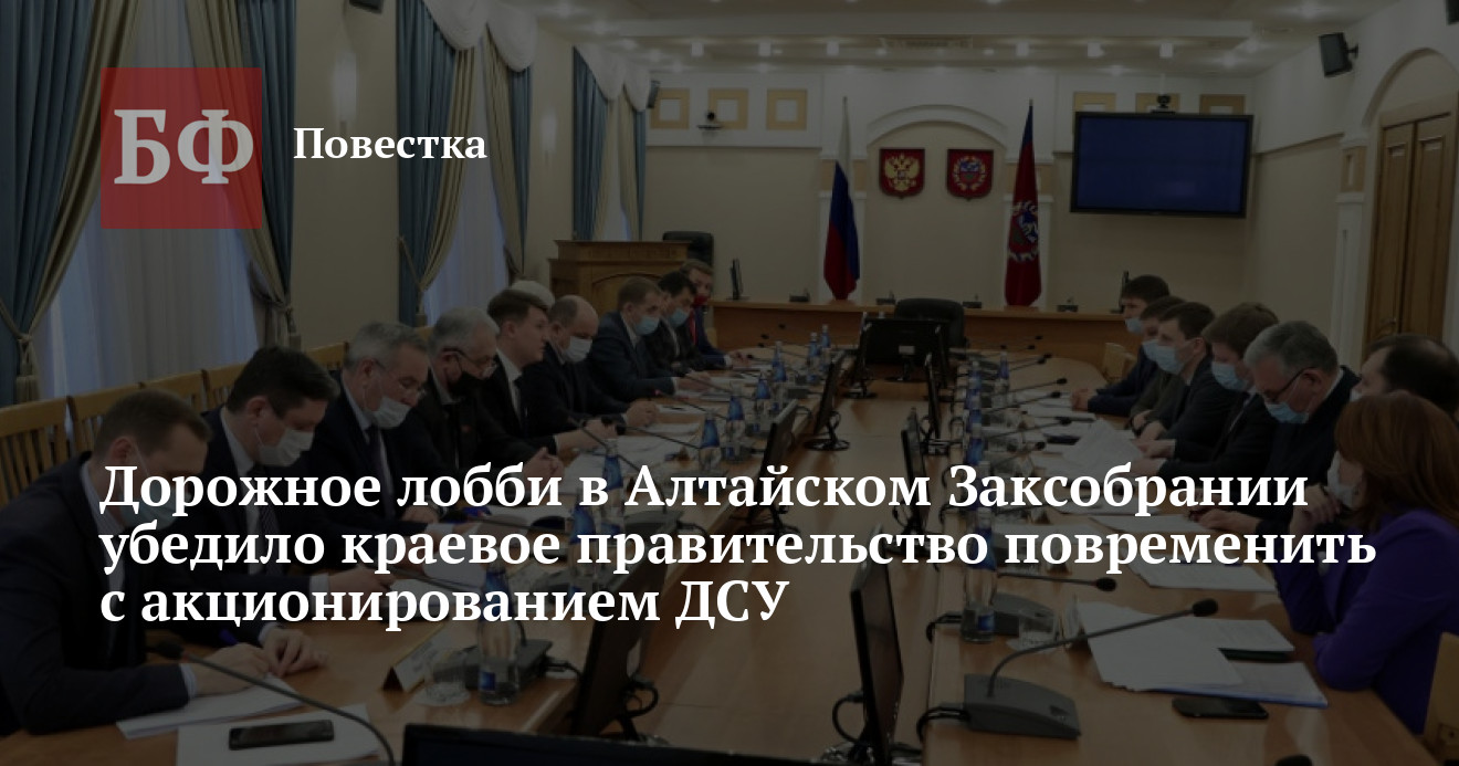 Отметим, что у истоков инициативы по обсуждению с правительством проекта изменений в прогнозный план приватизации имущества Алтайского края стояла непосредственно фракция «Единая Россия» в АКЗС. Из их первоначального сообщения следовало что представителей «партии власти» больше всего беспокоит именно акционирование шести ДСУ — «Центрального», «Северо-Западного», «Юго-Западного», «Северо-Восточного», «Южного» и «Юго-Восточного», которые сейчас существуют в форме ГУПов. Наблюдатели тогда высказывали мнение, что избирательный акцент представителей «партии власти» на ДСУ может говорить об активности дорожного лобби, представителей которого в рядах алтайских единороссов немало. Как правило, дорожные предприятия в статусе ГУП в Алтайском крае имеют обширные портфели госконтрактов, что наблюдатели как раз связывают с их статусом. Высокая информированность о проводимых госзакупках и доступ к конкурсам не только дает унитарным предприятиям некоторое преимущество перед частными конкурентами, но и создает дополнительные коррупционные риски, примерами которых изобилует инфополе в Алтайском крае.