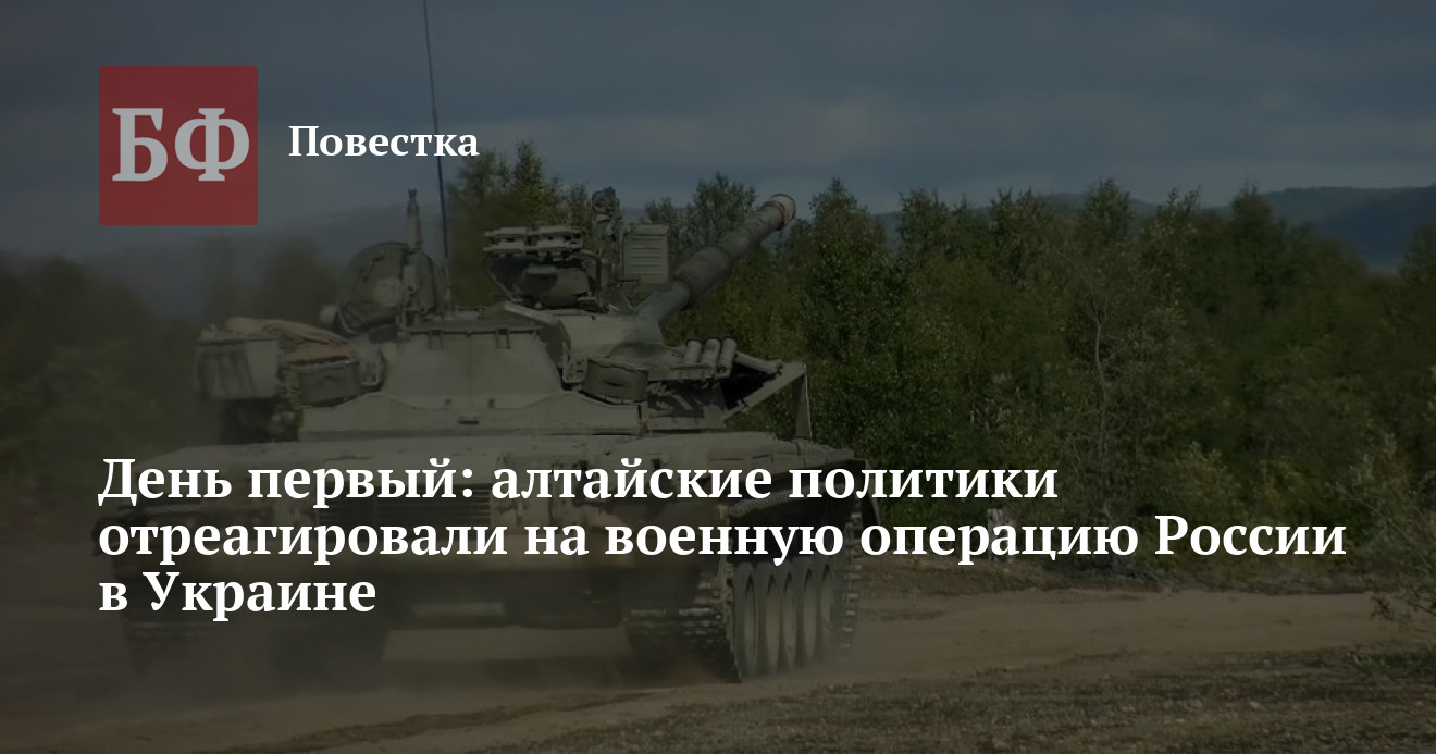 Алтайские единороссы и эсеры высказали поддержку действиям вооруженных сил. Например, депутат от ЕР в Барнаульской Гордуме Иван Огнев считает, что признание ЛДНР было необходимым шагом, и что россиянам сейчас как никогда нужно сплотиться вокруг президента Владимира Путина. «Просмотрел новости за сегодня, вчера, месяц, углубился дальше и увидел, что мы совсем перестали замечать в своем желании мира, что к нашим границам практически ежедневно стягиваются войска иностранных государств. И для того, чтобы нам не проснуться „22 июня ровно в четыре утра“, нам нужно сегодня как никогда действовать решительно», — пишет Огнев.