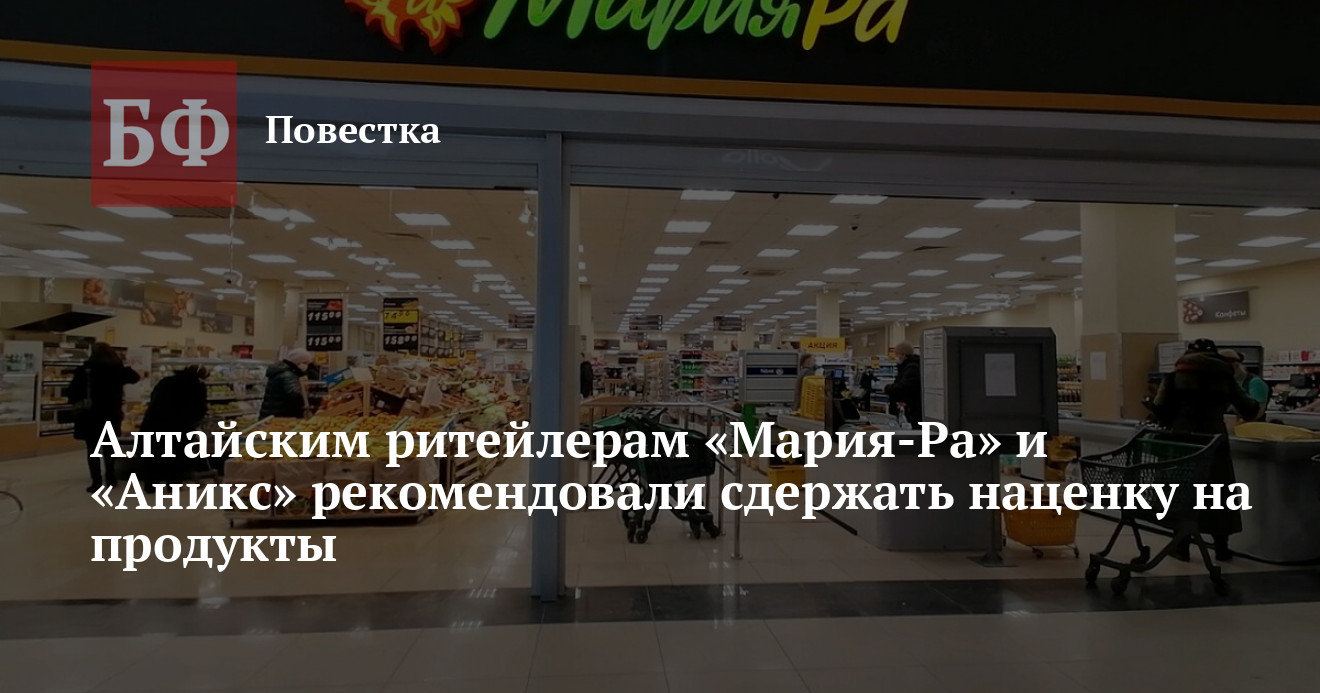 В региональном управлении по развитию предпринимательства и рыночной инфраструктуры «Банкфаксу» сообщили, что о таких мерах по сдерживанию инфляции и снижению социальной напряженности проинформированы и на краевом уровне. Ведомство довело такие же рекомендации о наценках до локальных торговых объектов. Кроме того, федеральные объединения «Ассоциация компаний розничной торговли» и «Союз независимых сетей» проинформировало об этом алтайские торговые сети «Мария-Ра» и «Аникс».