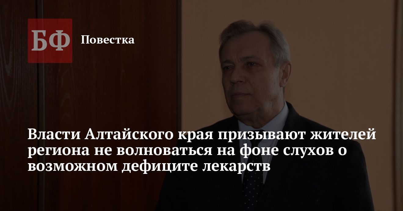 Председатель комитета по здравоохранению Алтайского Заксобрания Владимир Лещенко заверил жителей региона, что на данный момент нет оснований для волнений по поводу лекарственного обеспечения. Он рассказал «Катуни 24», что сейчас в крае есть и долговременные запасы препаратов, и заключенные договоры на поставки. Той же версии придерживаются и в региональном Минздраве.