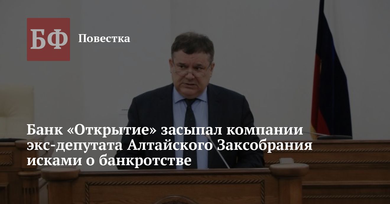 Еще в ноябре 2021 года МИФНС России № 16 по Алтайскому краю потребовало в суде банкротства ООО «СПТК-Кондитер». В карточке в числе заявителей упоминается и «Открытие», однако не указано, когда банк вступил в дело и размер его требований. Налоговики указывали вполне конкретную цифру: 1,013 млн рублей долгов по обязательным платежам. Тогда «СПТК-Кондитер» частично погасило долг, и 14 марта 2022 года производство по делу было прекращено. Однако 18 марта было подано отдельное заявление «Открытия» о банкротстве фирмы экс-депутата, 21 марта оно было принято к производству.