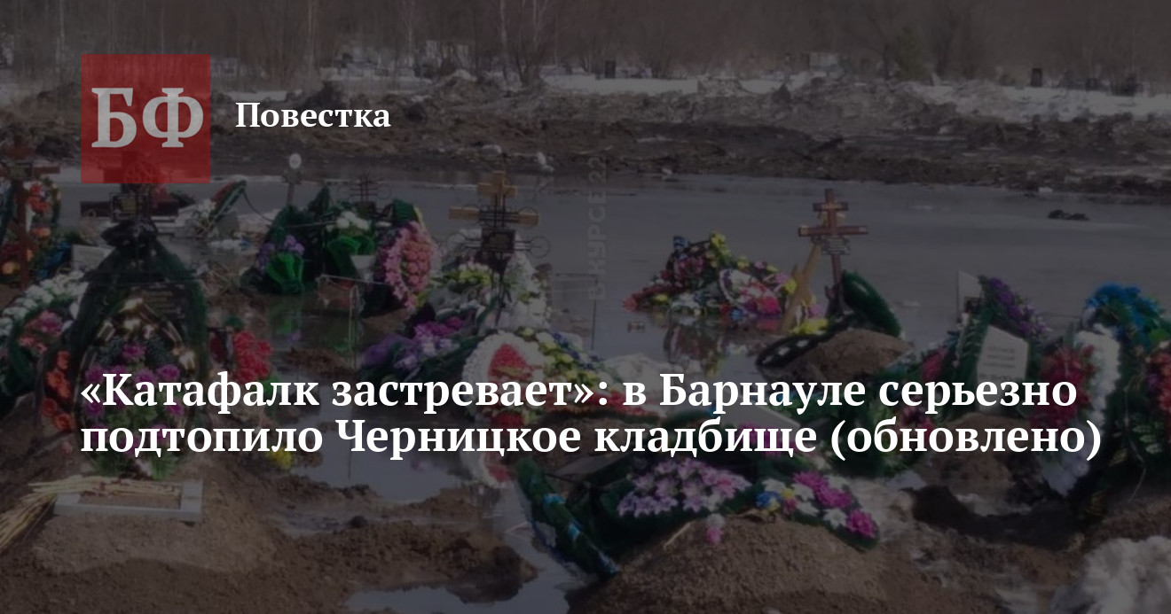 UPD 16:45: Около 15:00 пресс-центр администрации Барнаула сообщил о проведении работ на Черницком кладбище. «Незамедлительно сотрудниками МУП „Специализированная похоронная служба“ города Барнаула были предприняты меры по ликвидации подтопления. Произведено устройство водоотводных каналов, работает водооткачивающая техника», — заявили чиновники. По словам руководителя МУП «Специализированная похоронная служба» Андрея Никулина, подтопление талыми водами произошло в квартале № 71, который расположен в низменной части. Проезд транспорта на затопленную территорию якобы был закрыт администрацией кладбища 4 апреля. Территория огорожена ограничительными лентами.