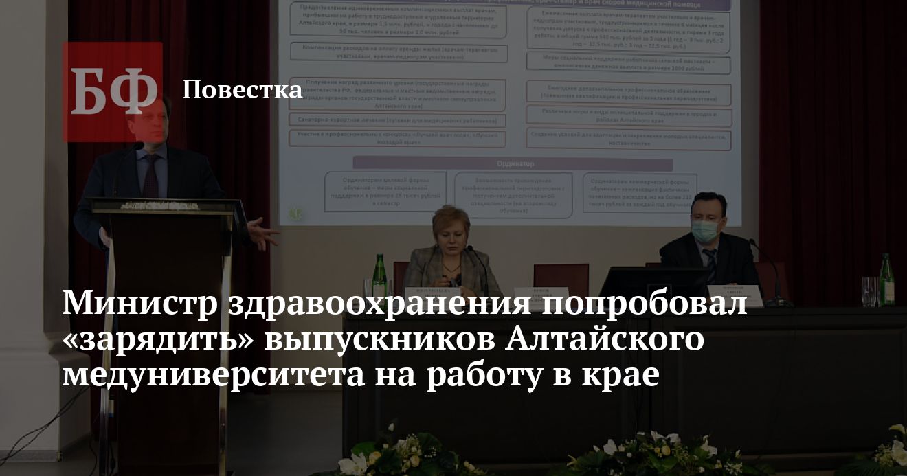 Как указывает министерство, встреча прошла для обучающихся бюджетного и коммерческого набора, которые не имеют договорных обязательств с медицинскими организациями края и самостоятельно будут заниматься поиском вакансий. В рамках плана работы по содействию трудоустройству выпускников в АГМУ пришло руководство Минздрава. «Мероприятие, прежде всего, должно помочь студентам сориентироваться на рынке труда Алтайского края, определиться с местом старта профессионального пути, а также зарядить уверенностью на успешное трудоустройство», — указаны цели на сайте ведомства.