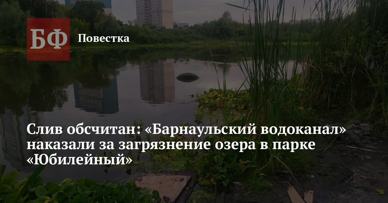 ООО «Барнаульский водоканал» привлекли к ответственности из-за попадания канализационных стоков в безымянное озеро на территории парка «Юбилейный». Об этом ИА «Банкфакс» сообщило Южно-Сибирское межрегиональное управление Росприроднадзора в ответ на запрос. Инцидент произошел в январе 2022 года, однако, по мнению некоторых горожан, загрязнение продолжается, а в результате январского инцидента погибла фауна водоема. В Росприроднадзоре по итогам проверки 12 апреля пришли к выводу, что это не так.