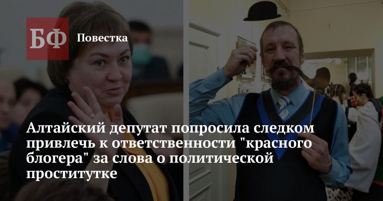 Депутат Алтайского Заксобрания Евгения Боровикова подала заявления в следком и МВД с просьбой разобраться в словах коммуниста Юрия Красильникова, который назвал ее политической проституткой и стукачкой…