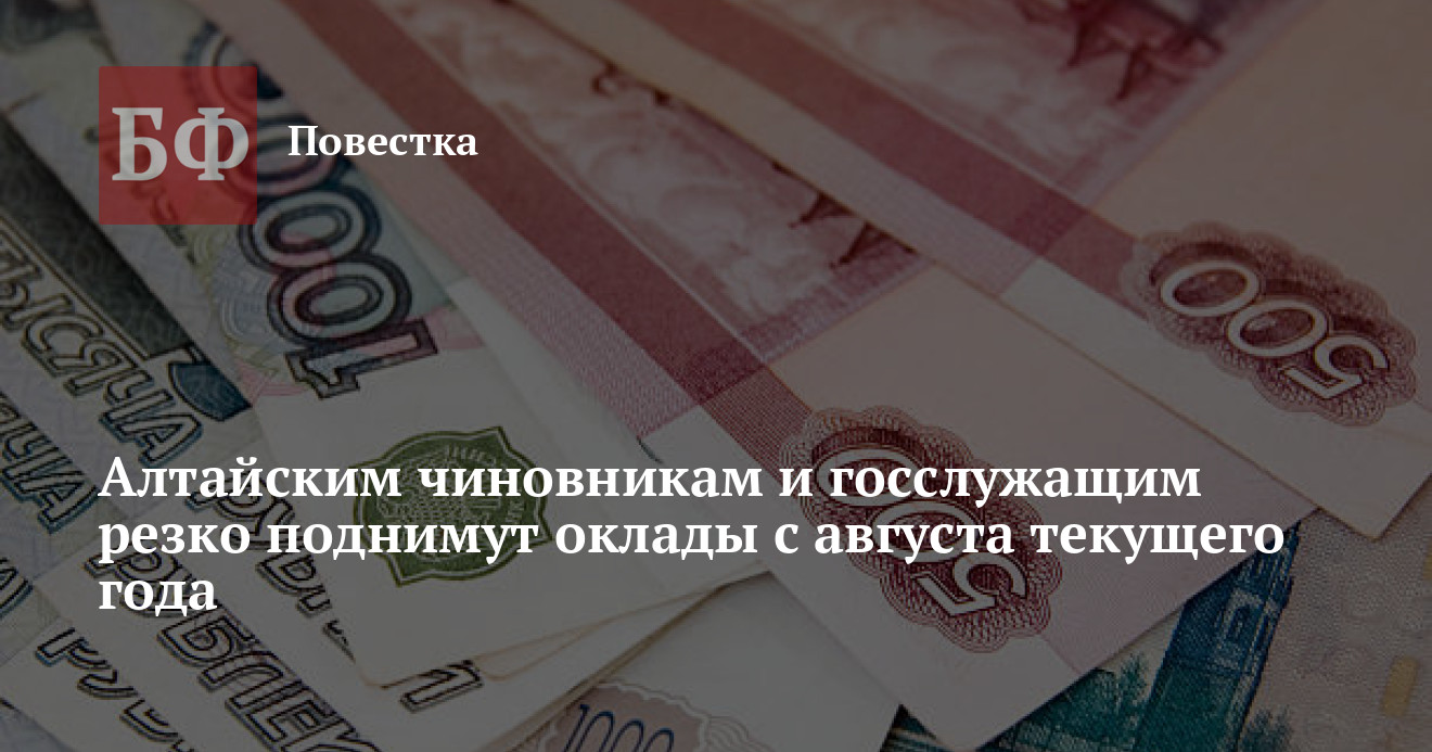 В первоначальной версии указа губернатора Алтайского края от 16 декабря 2016 года № 166 «О размерах должностных окладов и окладов за классный чин государственных гражданских служащих Алтайского края» перечислен диапазон сумм. Так, самые крупные должностные оклады тогда были установлены для замруководителей администрации губернатора и краевого правительства, замминистров, начальников департаментов в администрации губернатора и правительства, руководителя секретариата главы региона, управделами губернатора и правительства края, начальников управлений, руководителя инспекции Алтайского края, руководителя аппарата АКЗС, а также у руководителя информационного центра Алтайкрайизбиркома. В конце 2016 года их утвердили в размере 8659 рублей в месяц. Для остальных они были меньше, самые маленькие цифры были в графе «специалист» — 2019 рублей в месяц.