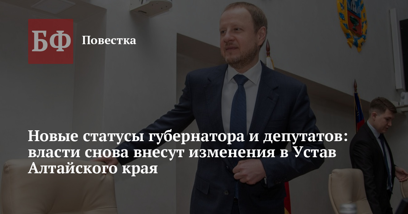 Вопрос нового этапа реформирования Устава Алтайского края был поднят на заседании правительства 18 мая. Представитель губернатора и кабмина в Заксобрании Наталья Кувшинова рассказала, что изменения связаны с поправками в Конституцию РФ, принятыми в 2020 году, по мотивам которых в конце прошлого года был утвержден федеральный закон «Об общих принципах организации публичной власти в субъектах РФ». Нововведения требуют серьезных изменений в основном законе региона, которые будут обсуждаться в течение следующих нескольких месяцев, отметила спикер. С ее слов, речь идет о десятках поправок, которые помимо формального приведения в соответствие, в частности, будут касаться полномочий губернатора, депутатов АКЗС, а также затронут экономический блок.