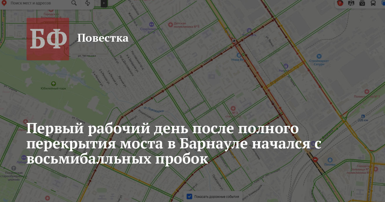 В утренний час пик 23 мая Барнаул встал в пробках, которые, по данным портала «Яндекс.Карты», достигли восьми баллов. Наиболее серьезная ситуация, судя по комментариям горожан, сложилась на улице Северо-Западной. Это произошло на фоне перекрытия моста на проспекте Ленина в районе Нового рынка. На прошедшем перед этим совещании в администрации города вице-мэр по дорожному хозяйству Антон Шеломенцев сказал, что граждане привыкнут к такой ситуации в течение полутора месяцев.