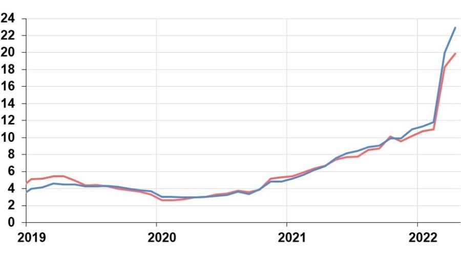 Продовольственные товары также продолжили дорожать: на 22,72% в годовом выражении в апреле против 20,48% в марте. В частности, это произошло на фоне роста цен на отдельные компоненты кормовой базы, ветеринарные препараты и упаковку из-за трудностей с международными поставками. Это повлекло удорожание питьевого молока, кисломолочной продукции, сметаны, сливочного масла и сыра.