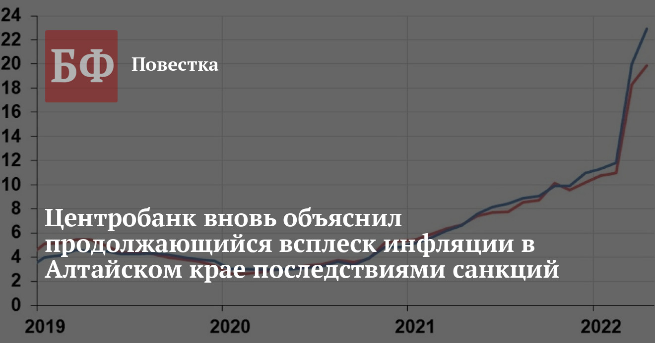 По сравнению с мартом рост цен на товары и услуги в Алтайском крае в апреле вырос на 1,62 п. п. год к году. Инфляция продолжила ускоряться в связи с «последствиями введенных внешних санкций — ростом издержек производителей, нарушением логистических цепочек, а также ростом спроса на отдельных рынках», отметил ЦБ. Показатель в 19,9% опередил как Сибирский федеральный округ (19,35%), так и Россию в целом (17,83%).