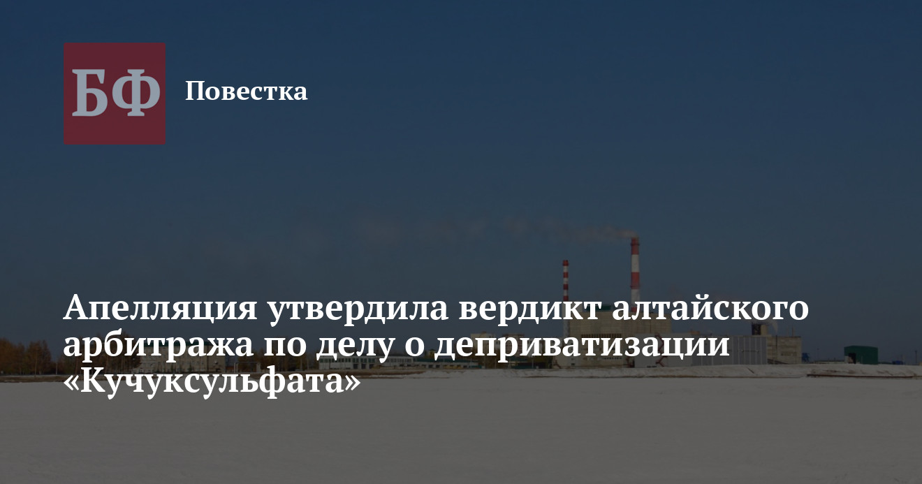 Седьмой арбитражный апелляционный суд в Томске не удовлетворил жалобы акционеров ОАО «Кучуксульфат» и представителей самой компании на решение краевого арбитража, согласно которому большая часть пакета акций общества должна перейти в собственность государства. Таким образом, вердикт первой инстанции вступил в силу и ценные бумаги получит Росимущество. Генпрокуратура добивалась этого из-за имевших место нарушений при приватизации предприятия в 1990-х годах.