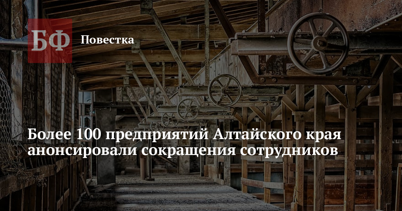 Грядущие сокращения 500 сотрудников на «Барнаульском станкостроительном заводе» не станут уникальным явлением в Алтайском крае. Как рассказала ТАСС замначальника управления Алтайского края по труду и занятости населения Елена Чувашова, всего о высвобождении сотрудников сообщили свыше 100 предприятий региона, в ближайшее время работу придется искать более 800 гражданам.