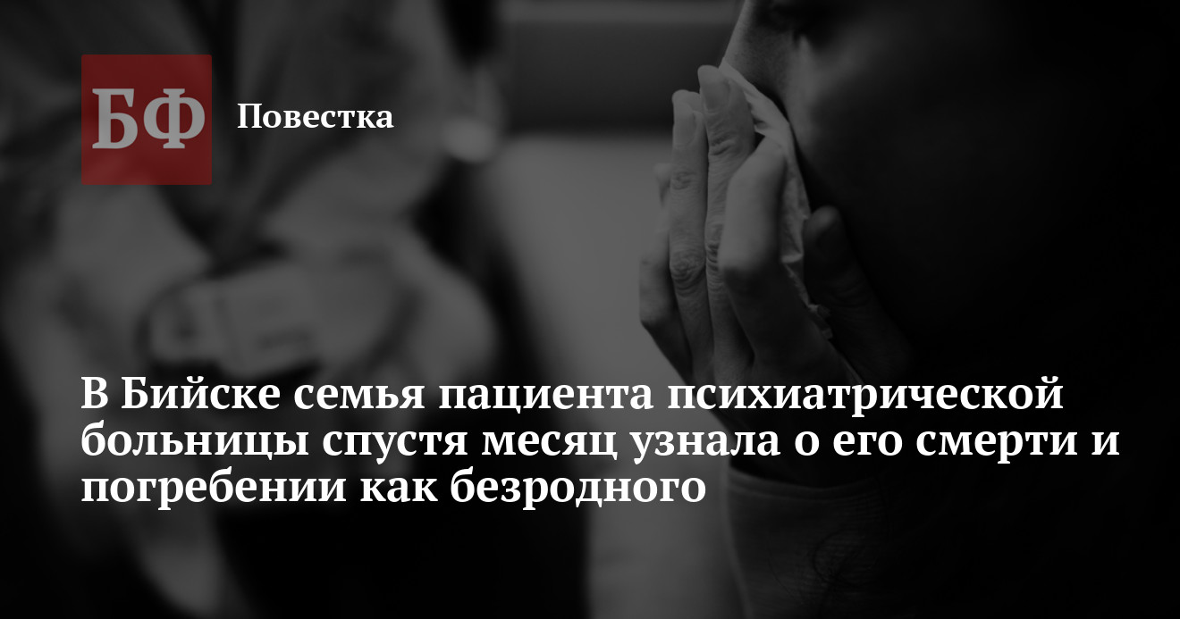Во второй раз бийчанин попал в психбольницу 22 апреля. По словам его сестры, родители еженедельно звонили в медучреждение, чтобы справиться о самочувствии сына. Медики дежурно отвечали: «Состояние стабильное, сам себя обслуживает». Также родители привозили для Сергея передачи. По словам Александровой, две недели назад кто-то из медработников сказал родителям, что мужчине нужны печенье, сок и яблоки. Все перечисленное они передали. И только 22 июня матери Сергея с извинениями сообщили, что ее сын скончался еще 7 мая и был похоронен как безродный.