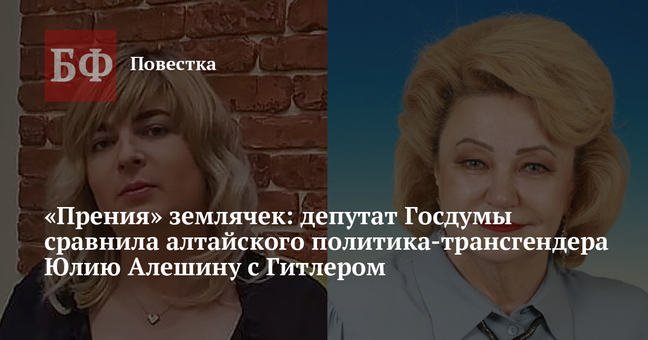 Руководитель алтайского реготделения партии «Гражданская инициатива», трансгендер Юлия Алешина поучаствовала в пресс-конференции, посвященной намерениям ВОЗ признать существование третьего пола. Одним из главных спикеров выступила депутат Госдумы от КПРФ, также уроженка Алтайского края Нина Останина, которая хочет ввести в Россию уголовную ответственность за «пропаганду нетрадиционных отношений» среди взрослых и на конференции яро отстаивала традиционные семейные ценности, говорила о необходимости наказывать за любую пропаганду гомосексуализма, а также лечения людей с такими взглядами. В ходе всего мероприятия между ней и Алешиной возникали перепалки, а в один момент думец назвала оппонентку продолжательницей миссии Гитлера по уничтожению российского населения и допустила другие резкие высказывания.