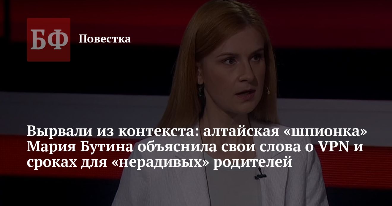 Уроженка Барнаула и депутат Госдумы от «Единой России» Мария Бутина, получившая известность из-за заключения в тюрьме США, была вынуждена объясниться перед пользователями соцсетей после того, как в Интернете ей стали активно приписывать инициативу сажать родителей за использование их детьми VPN для получения доступа к заблокированным в России сайтам. Депутат в своем Telegram-канале заявила, что ее слова, произнесенные на программе «Вечер с Владимиром Соловьевым», вырвали из контекста. Действительно, конкретно о сроках за анонимайзеры Бутина не говорила, но допустила ряд других громких высказываний.