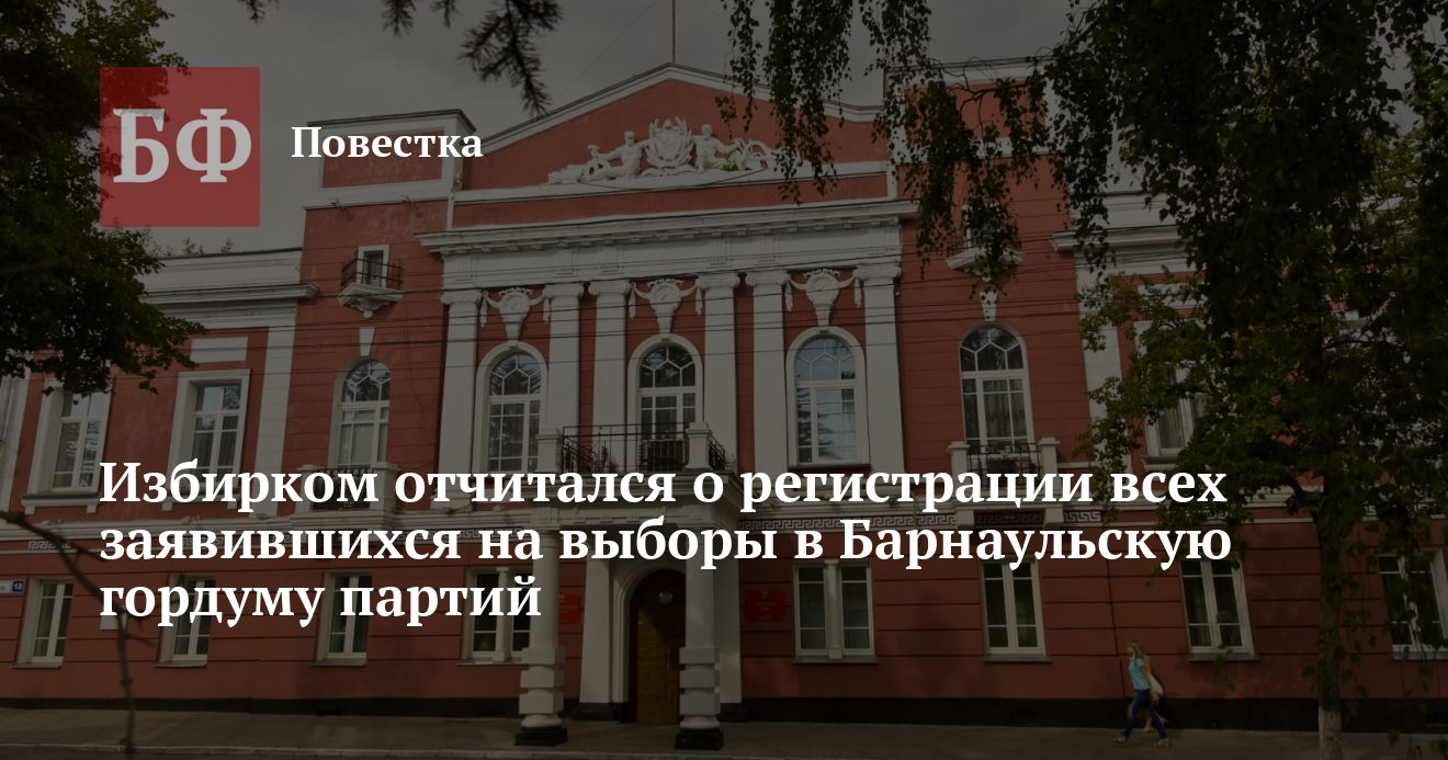 Как рассказал председатель Центральной районной ТИК Барнаула Виталий Замаруев, по состоянию на 8 августа 2022 года зарегистрировали девять муниципальных списков кандидатов в депутаты Барнаульской гордумы, которых выдвинули политические партии — «Новые люди», ЛДПР, КПРФ, «Единая Россия», «Коммунисты России», «Справедливая Россия — Патриоты — За правду», «Родина», «Зеленые» и «Российская партия пенсионеров за социальную справедливость». «Таким образом, в настоящий момент 447 кандидатов, выдвинутых в составах муниципальных списков кандидатов, претендуют на 20 депутатских мандатов», — сказал Замураев.