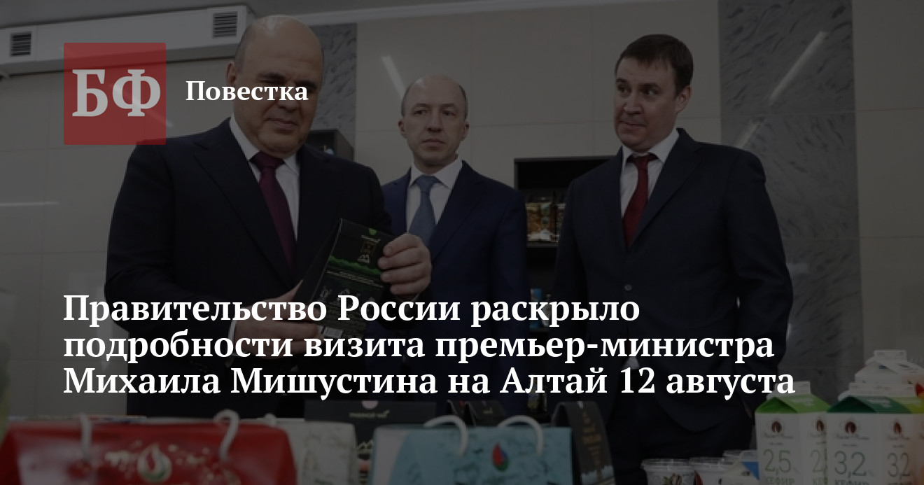 ТАСС добавил, что во время визита его будут сопровождать вице-премьер, полпред президента в ДФО Юрий Трутнев, вице-премьер Марат Хуснуллин, глава Минприроды РФ Александр Козлов, министр ГО и ЧС Александр Куренков, министр здравоохранения Михаил Мурашко, министр строительства и ЖКХ Ирек Файзуллин, министр по развитию Дальнего Востока и Арктики Алексей Чекунков. Кроме того, уже известно, что на Алтае работает высшее руководство Сбера — финорганизация развивает в регионе курорт «Манжерок». Не исключено, что Михаил Мишустин и другие члены правительства посетят этот объект.