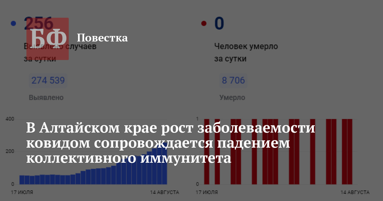 В Алтайском крае усугубляется ситуация по COVID-19. По данным сайта Стопкоронавирус. рф, счет заболевшим теперь идет на сотни — за 14 августа зарегистрировали 256 положительных теста. При этом коллективный иммунитет продолжает снижаться: если на начало августа он был равен 9,6%, но на середину месяца — 6,5%. Падение не останавливается, несмотря на увещевания властей о вакцинации в преддверии очередной волны эпидемии.