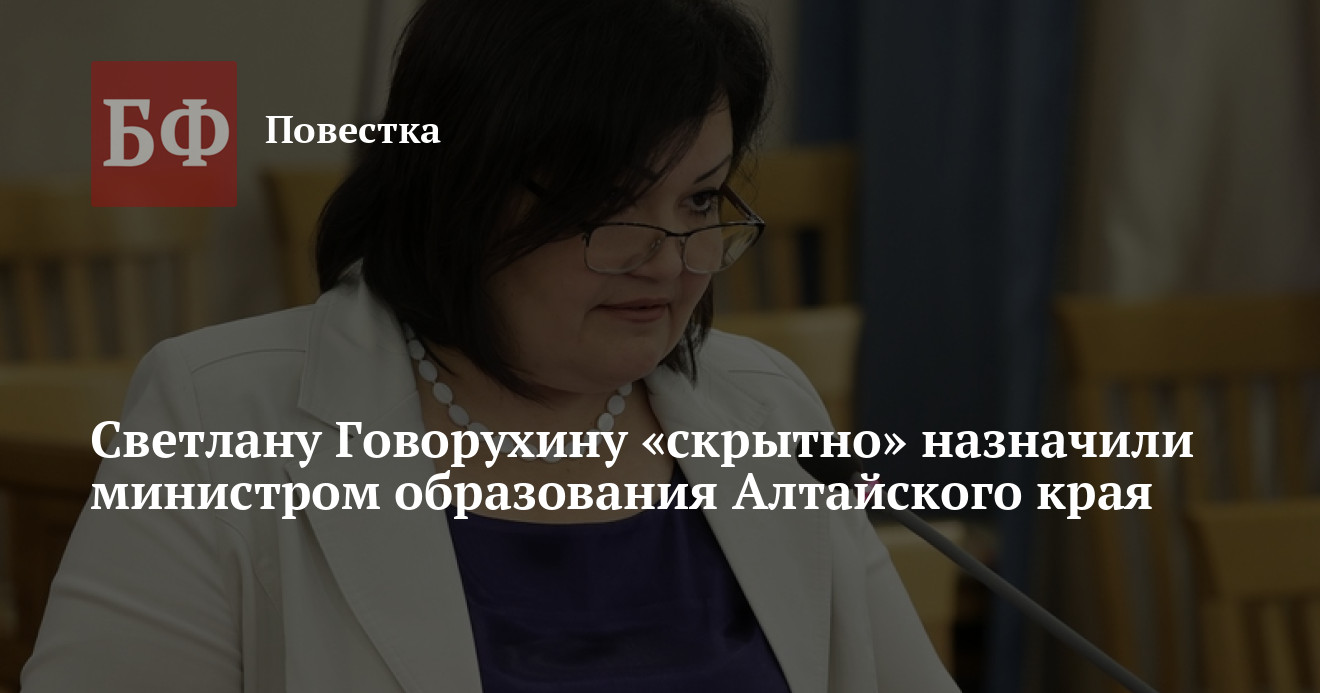 По данным СМИ, губернатор Алтайского края Виктор Томенко подписал распоряжение о назначении Светланы Говорухиной министром образования и науки региона. В должность она вступила с 15 августа.