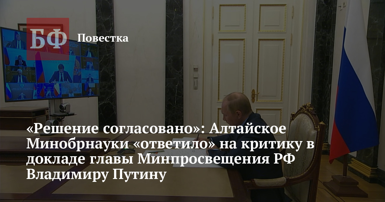 Владимир Путин в ответ попросил министра выяснить, по чьей вине это произошло. «Надо обязательно выявить, кто в этом виноват, и посмотреть на подрядчиков, которые в нужные сроки не выполнили необходимый объем работ, и соответствующим образом отреагировать. Зачем с ними в дальнейшем заключать контракты на подобные работы?» — приводятся слова президента на сайте Кремля. В комментарии Минобрнауки Алтайского края об ответственных за ситуацию и принятых к ним мерах ничего не говорится. Возможно, на эти вопросы будут отвечать уже правоохранительные органы.