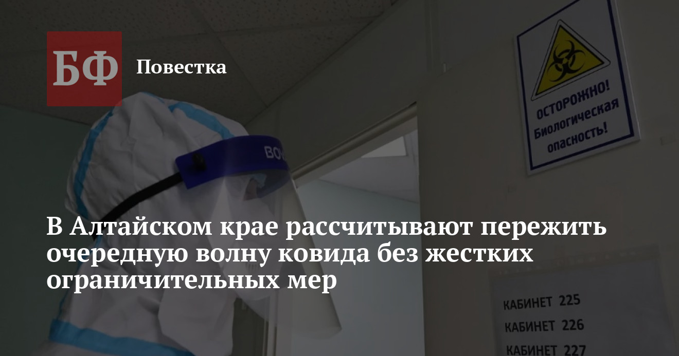 Шестая волна коронавируса, скорее всего, пройдет в Алтайском крае в условиях действующих ограничительных мер, их ужесточение пока не планируется, следует из выступления заместителя руководителя регионального управления Роспотребнадзора Ульяны Калининой на пресс-конференции в правительстве. По словам чиновницы, это связано с тем, что циркулирующий штамм «Омикрон» легче переносится заболевшими. По словам главы алтайского Минздрава Дмитрия Попова, сейчас в регионе в реанимационных отделениях находится всего 12 человек, хотя суточная заболеваемость приблизилась к 700 случаям.