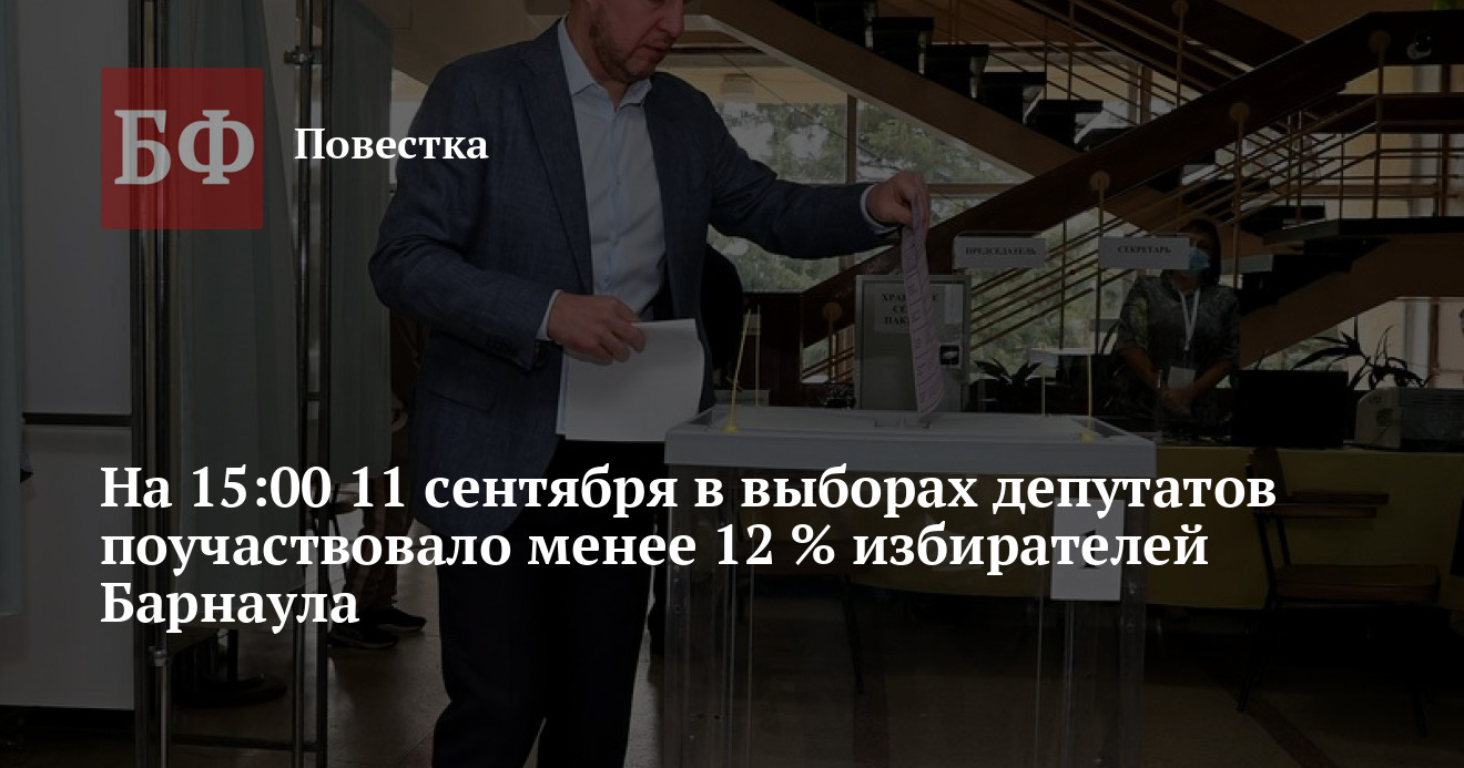 Трехдневные выборы депутатов городской Думы Барнаула подошли к финальному этапу — основному дню голосования. По данным на 15:00 11 сентября, явка избирателей составила 11,83%. Из городов, где голосование проходит в один день, жители Рубцовска показывают несколько большую активность, а вот в Бийске на участки пришло менее 10%.