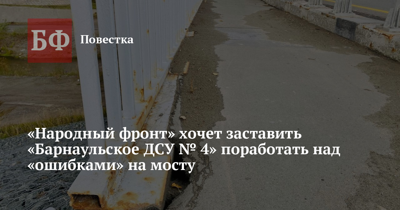 Как указывают активисты на своей площадке «ВКонтакте», они обнаружили ряд проблем на мосту через Барнаулку по объездной дороге через шоссе Ленточный бор. «Фронтовики» заметили, что деформационные швы на путепроводе уже не герметичны, из-за чего в дождливую погоду вода легко просачивается на несущие конструкции моста, что, по их мнению, в перспективе может отразиться на техническом состоянии сооружения. При этом общественники указывают, что мост реконструировали совсем недавно в рамках нацпроекта «Безопасные и качественные автомобильные дороги». «Деформационные швы должны быть герметичными и исключать возможность попадания воды, грязи и различных предметов на нижележащие конструкции и элементы моста. Строители об этом забыли? А как же испытания швов на герметичность? Они вообще проводились?», — вопрошают активисты. Кроме того, судя по опубликованным ими фото, кое-где на новом мосту уже появились дыры в асфальте, а в одном месте на дороге даже вылез металлический штырь. В этой связи общественники требуют, чтобы подрядная организация исправила все недочеты, при этом исполнителя контракта они не называют.