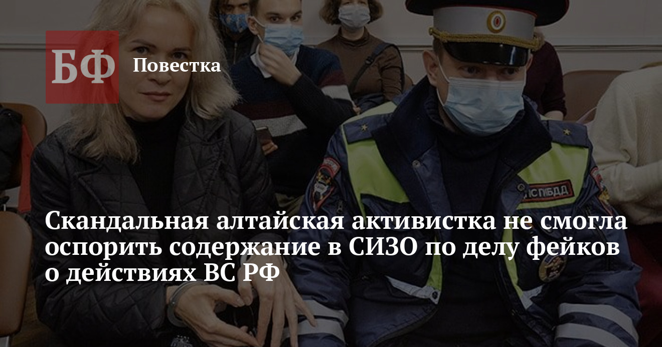 Известной барнаульской активистке Марии Пономаренко, которую обвиняют в распространении фейков о действиях ВС РФ, не удалось оспорить в Алтайском краевом суде меру пресечения в виде содержания под стражей. Соответствующая запись появилась на сайте инстанции. Портал RusNews, где работала Пономаренко, со ссылкой на ее адвоката пишет, что та уже признала свой проступок, хоть и не согласна с его квалификацией, и потому не оставляет попыток перейти из камеры под домашний арест. Между тем издание также указывает, что у обвиняемой якобы диагностировали расстройство личности.