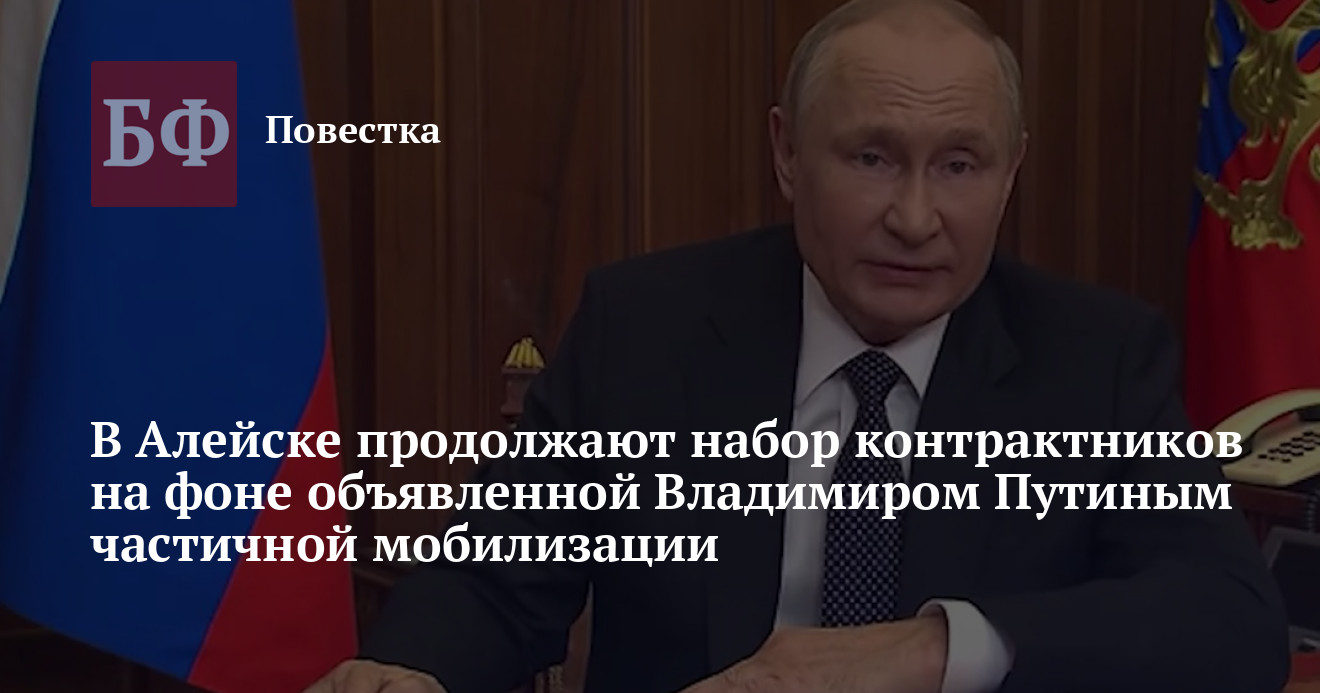 Президент подчеркнул, что граждане, призванные в ряды ВС РФ в период мобилизации, будут проходить службу на тех же условиях, что и контрактники, с сохранением всех мер социальной поддержки, о которых сообщалось ранее. Отметим, что в Алтайском крае до сих пор продолжается набор добровольцев для участия в специальной военной операции на Украине. Их подразделения формируют в Алейске. Вероятно, там же будут формировать и подразделения из призванных из запаса военнослужащих.