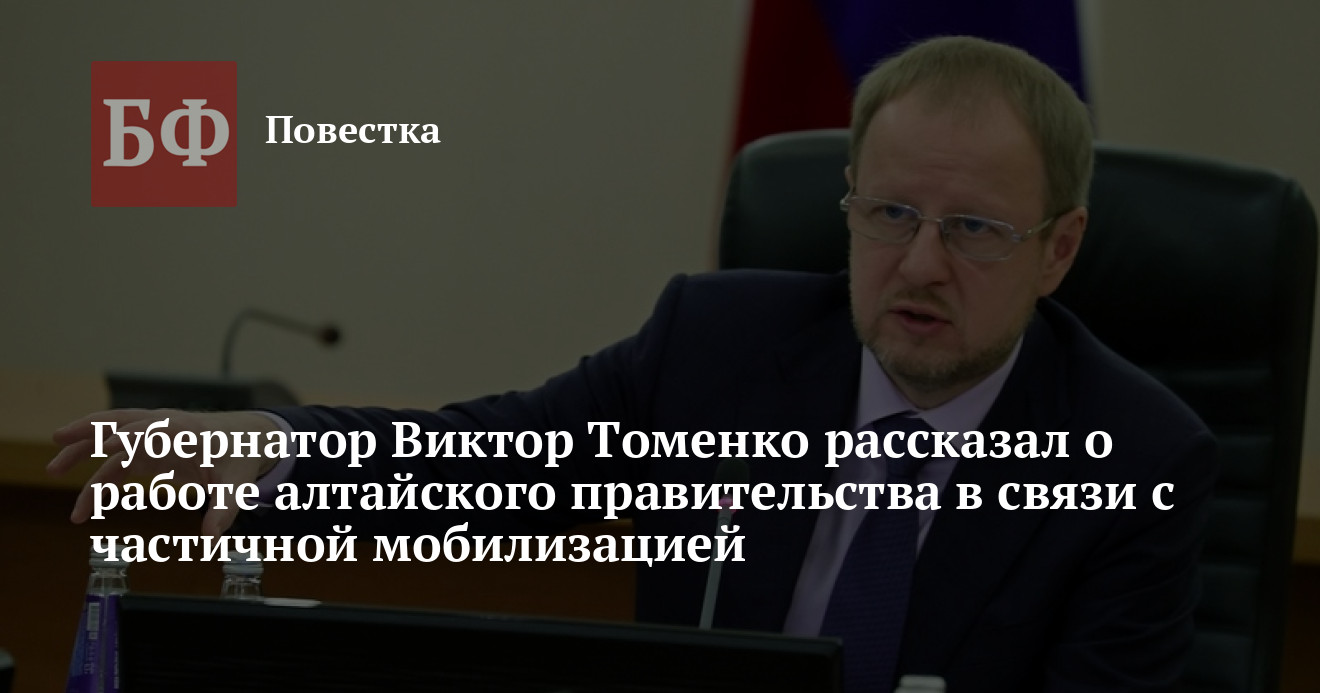 Глава региона напомнил чиновникам, что вся текущая работа, которую ведет правительство, проходит «под эгидой или на фоне, или с учетом процедуры частичной мобилизации». По его словам, она остается главной темой в информационном пространстве и оказывает влияние на разные процессы, в том числе на производственные, социальные и политические. В связи с этим необходимо учитывать данные обстоятельства и участвовать в регулировании вопросов, поскольку у краевых властей есть такие рычаги, отметил Томенко. Также он сказал членам кабмина, что если они со своей стороны не могут отреагировать на какие-то ситуации, то следует обращаться к нему или к зампредам Виталию Снесарю и Денису Губину.
