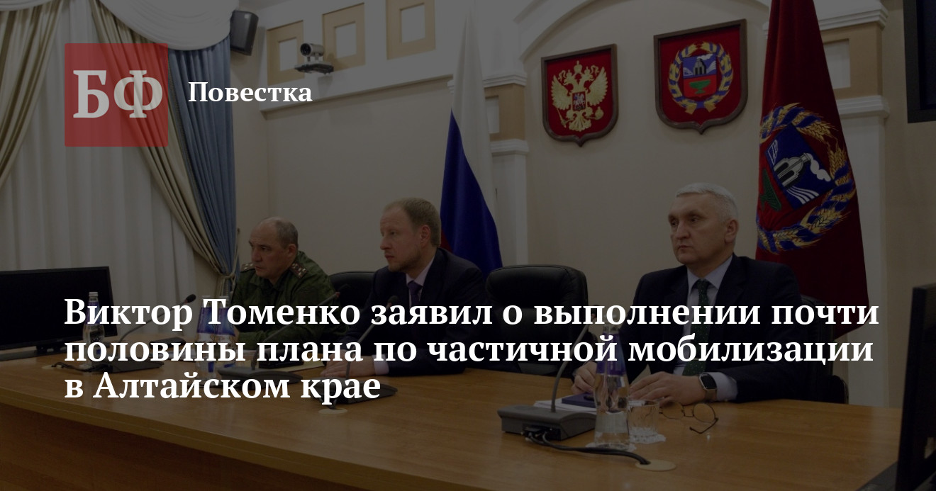 В кабмине состоялось видеоселекторное совещание на тему частичной мобилизации, в котором приняли участие члены правительства, руководители муниципалитетов и военные комиссары. Виктор Томенко, возглавляющий призывную комиссию, отметил, что призыв проходит в плановом порядке, в Омск ежедневно отправляются группы граждан. С его слов, по состоянию на 28 сентября Алтайский край выполнил около половины мобилизационного задания.