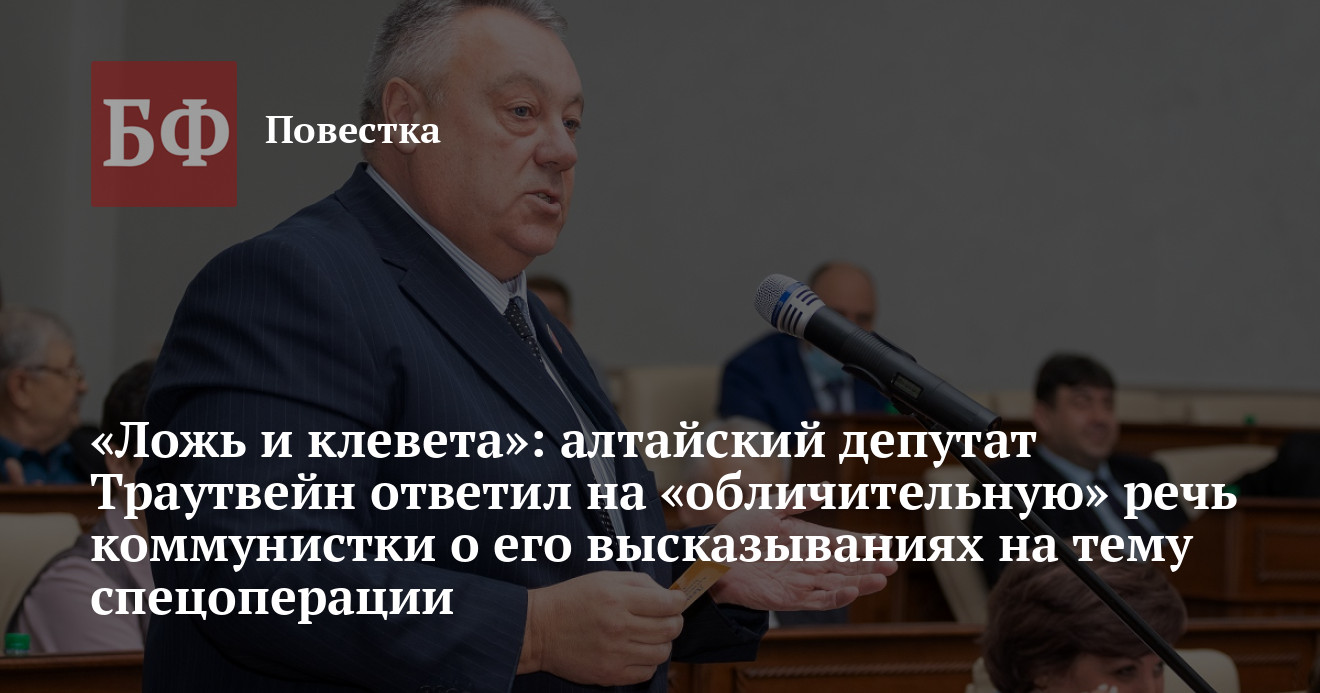Под занавес минувшей сессии Алтайского Заксобрания депутат от КПРФ Людмила Клюшникова заявила, что единоросс Александр Траутвейн устроил провокацию, которую должна проверить прокуратура. Он якобы подкалывал одного из коммунистов и саму женщину на тему частичной мобилизации в связи с участием ее сына в спецоперации. В частности, он «отправлял» их на передовую. Парламентарий в беседе с «Банкфаксом» сказал, что это был кулуарный разговор, и он ничего предосудительного не говорил.