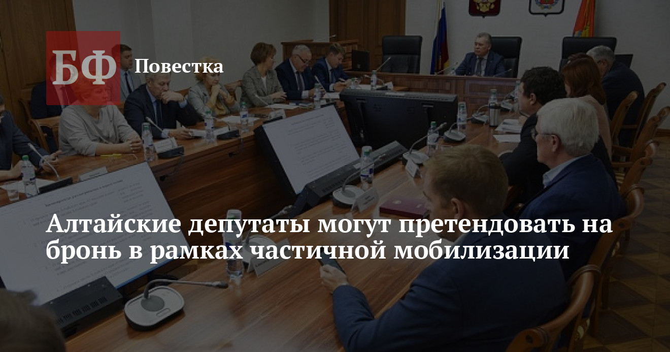 Зампред Алтайского Заксобрания Денис Голобородько пояснил, что в случае, если будет мобилизован региональный депутат, то его признают отсутствующим. Лишать мандата на время службы его не будут, но голосовать на сессиях он не сможет. Также он отметил, что некоторые парламентарии могут претендовать на бронирование в общем порядке с государственными и муниципальными служащими. По законодательству, таким сотрудникам дают освобождение от призыва в целях обеспечения деятельности госорганов. Эти вопросы согласует межведомственная комиссия. Как пояснил вице-спикер, в АКЗС под эту категорию могут подойти парламентарии, занимающие руководящие посты и работающие на постоянной основе, то есть за зарплату.