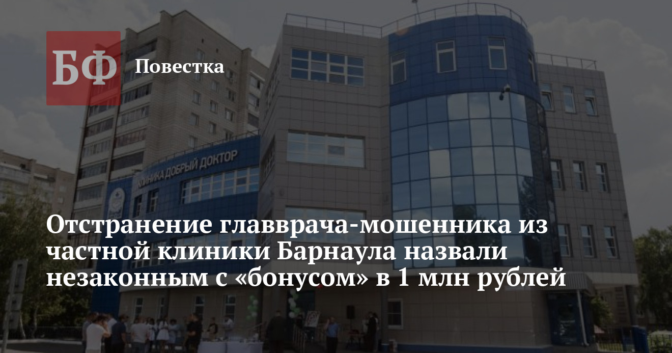 Главврач сети частных клиник Барнаула «Добрый доктор» Сергей Богданов доказал, что его незаконно отстранили от работы в конце 2021 года на фоне уголовного разбирательства о мошенничестве с ОМС на сумму более 100 млн рублей. Соответствующее решение вступило в законную силу, сообщили «Банкфаксу» в пресс-службе Алтайского краевого суда. Как удалось выяснить, медику также присудили более 1 млн рублей компенсации за простой.